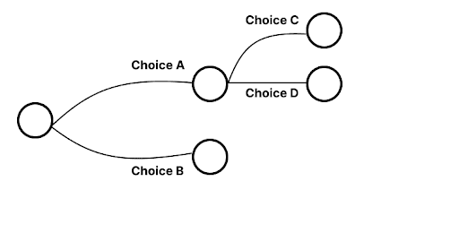 Following the above example, your thought process would be something like, "if I make choice A, then I can do C and D afterwards. Meanwhile, if I decide to do B, I don't have other options." At the same time, you might visualize the tree or draw it out. I like this approach to decision making because it gets me thinking about second and third order effects. By default, we over-weight first order effects for no good reason.